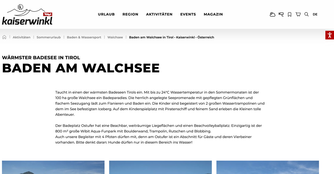 Der Walchsee ist der viertgrößte See Tirols und ein beliebter Badesee mit einer Wassertemperatur im Sommer von rund 25 Grad. Der See ist wegen seines Fischreichtums auch beliebt bei Anglern. Entfernung von unserem Ferienhaus: 38 km